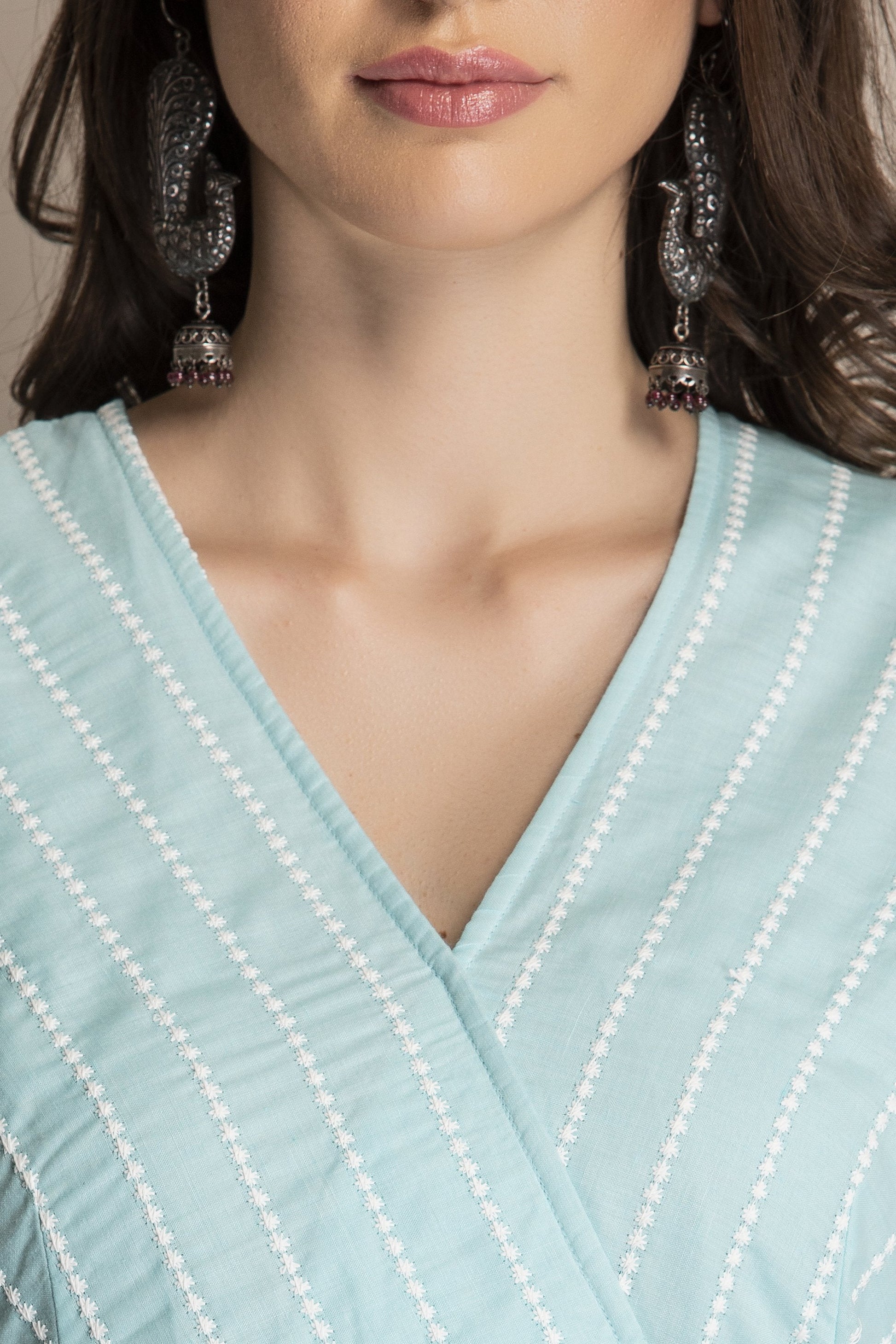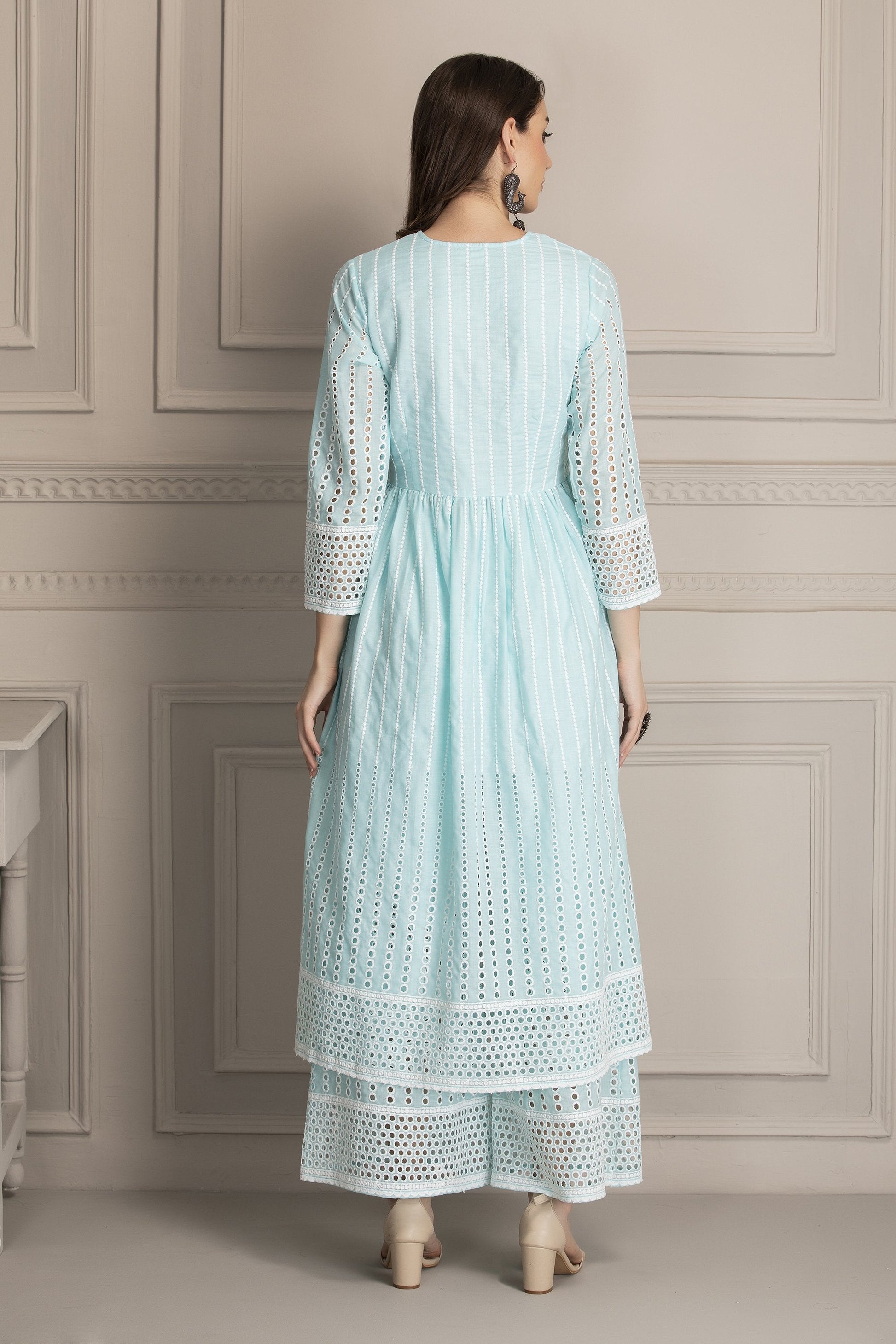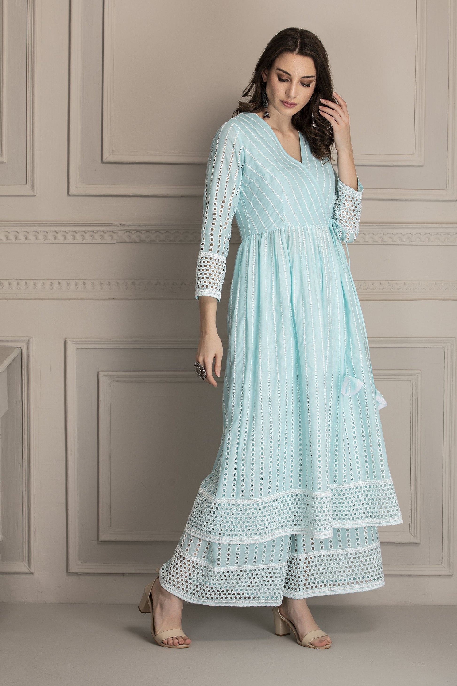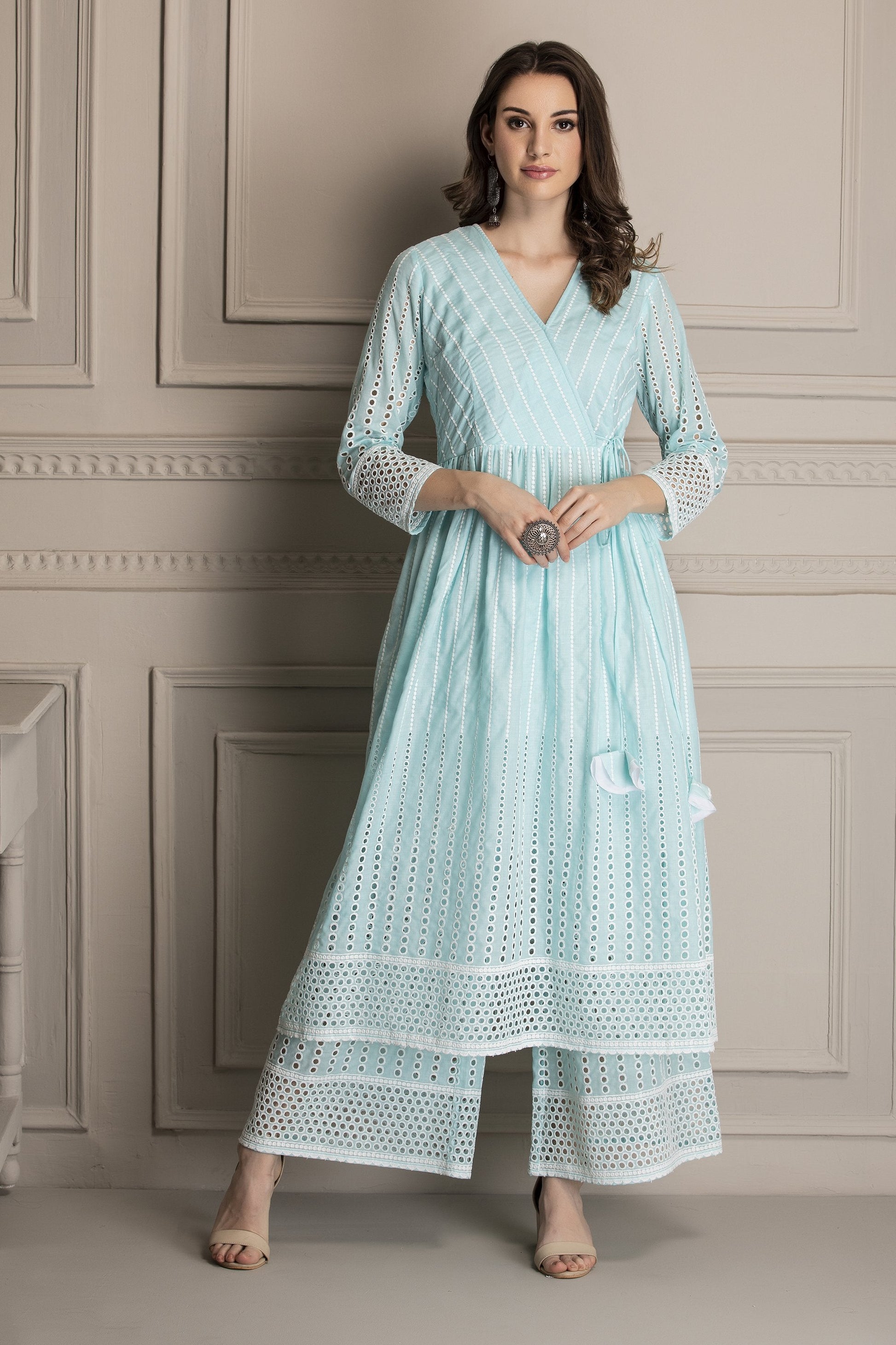 Adding a hint of vibrancy to this aqua chikan kurta and palazzo set from SEW is the angrakha style and neat embroidery. Fashioned from soft and smooth fabric, this set promises supreme comfort all day long. Team this set with heels and silver danglers.