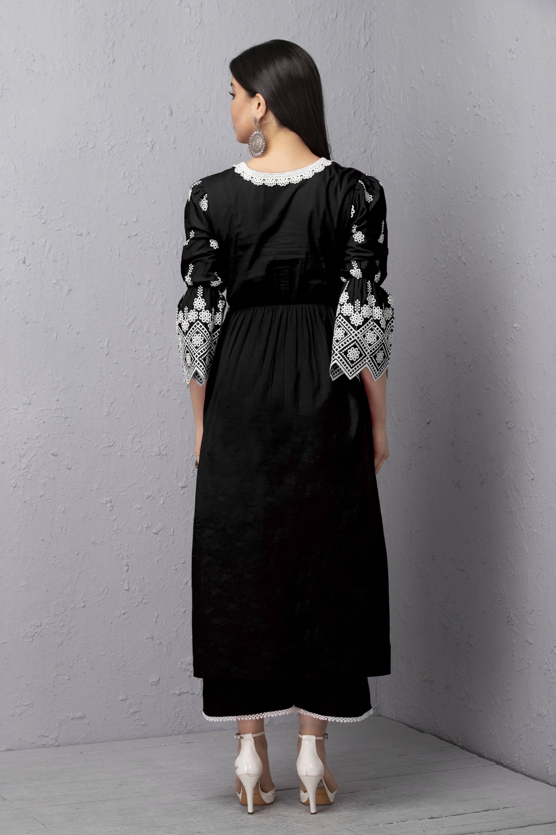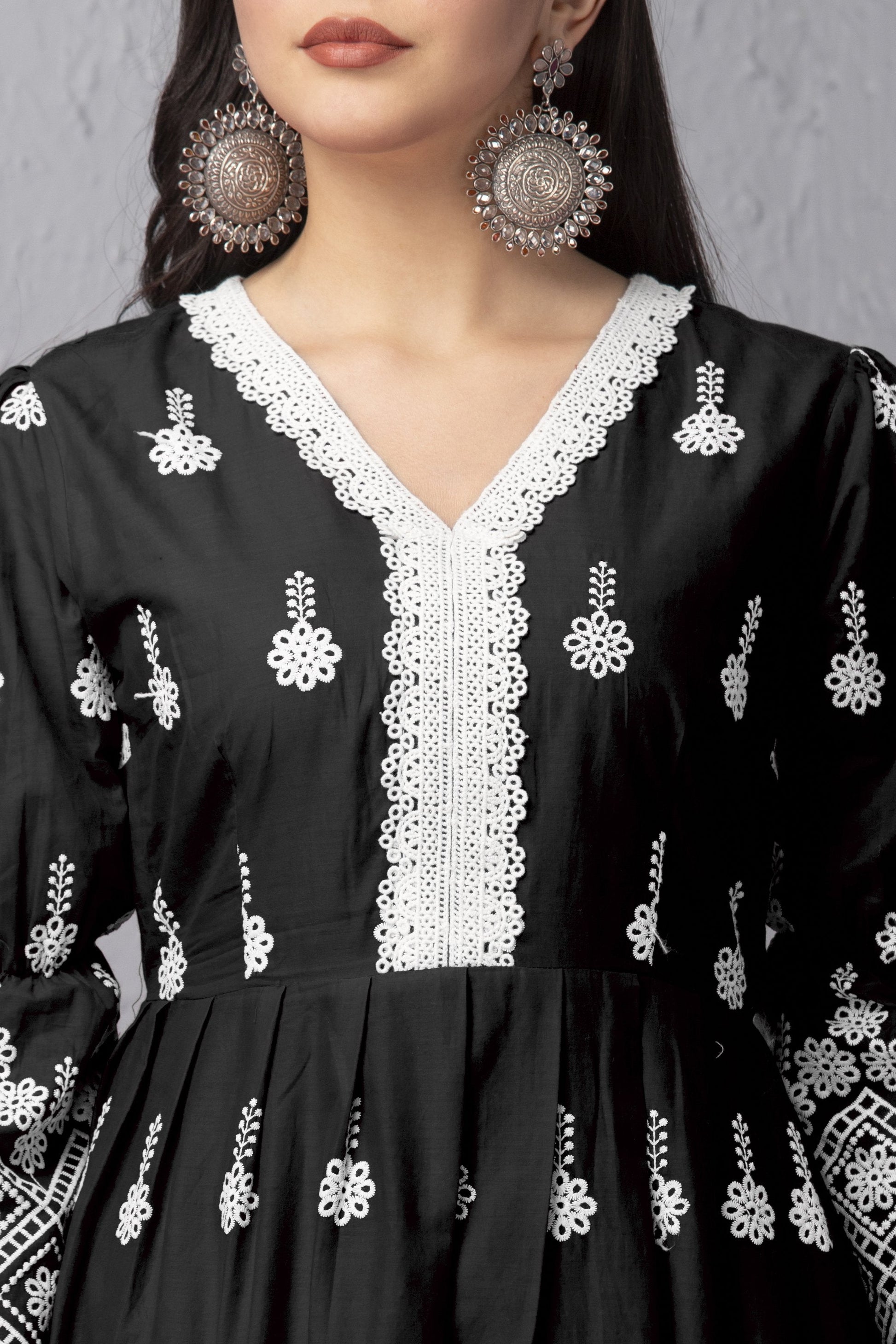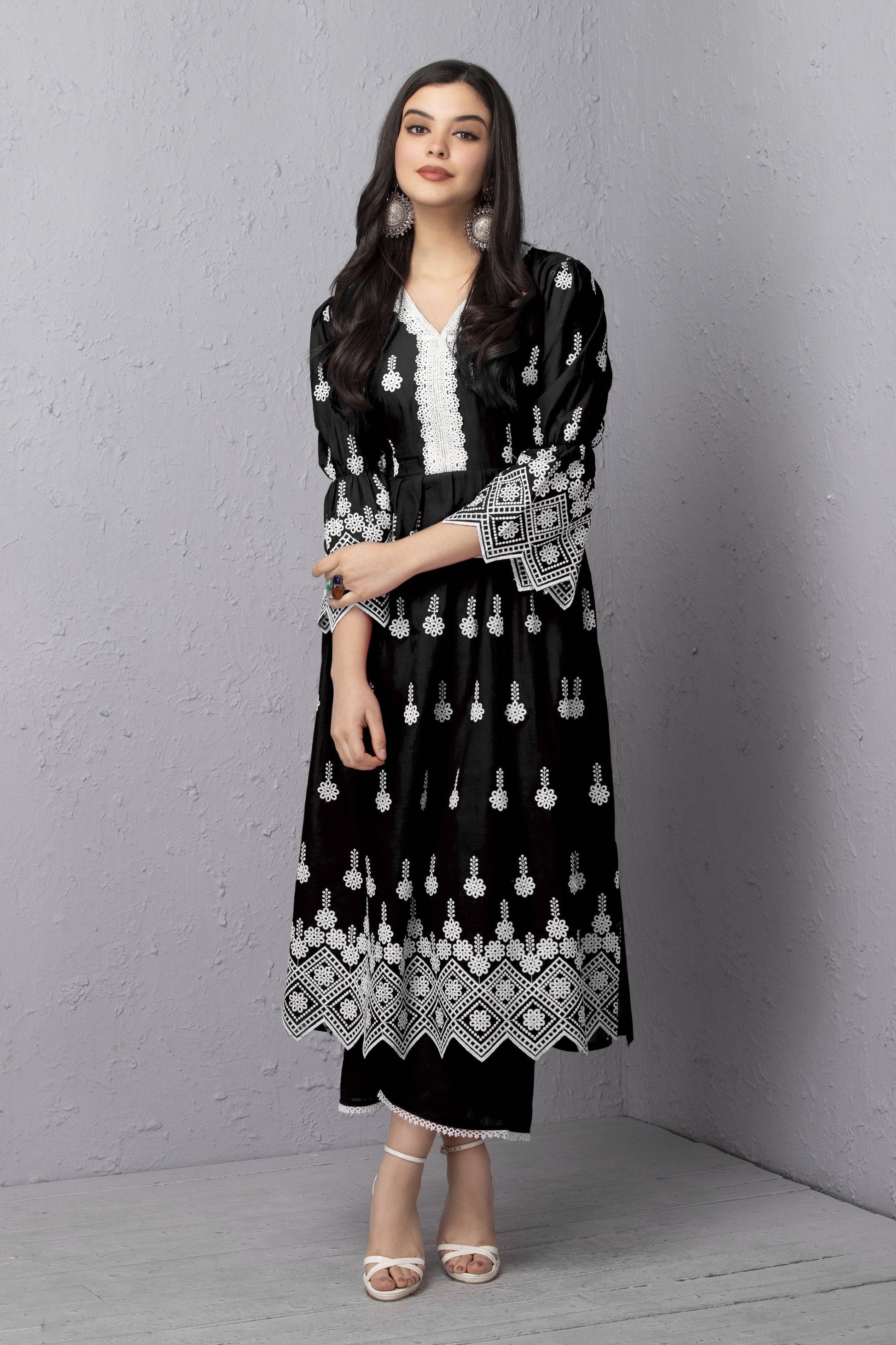 Spring is here and so are vibrant colors, make room for this beautiful Black Chikankari Floral Moftif kurta and palazzo set in your spring wardrobe. This anarkali style kurta, with lace embossed neckline and intricate scalloped borders is a unique style. Fashioned from cotton fabric, this set promises supreme comfort all day long. Team this set with heels and earrings for a classic look.