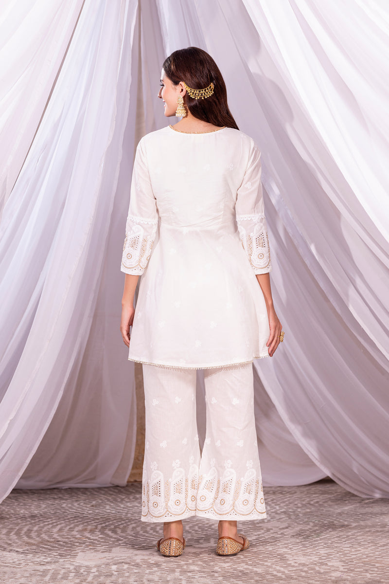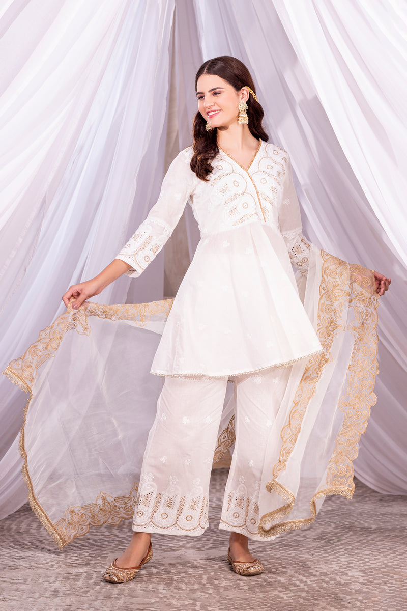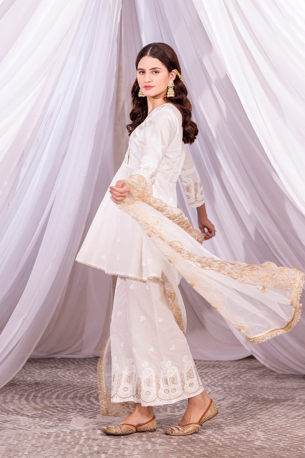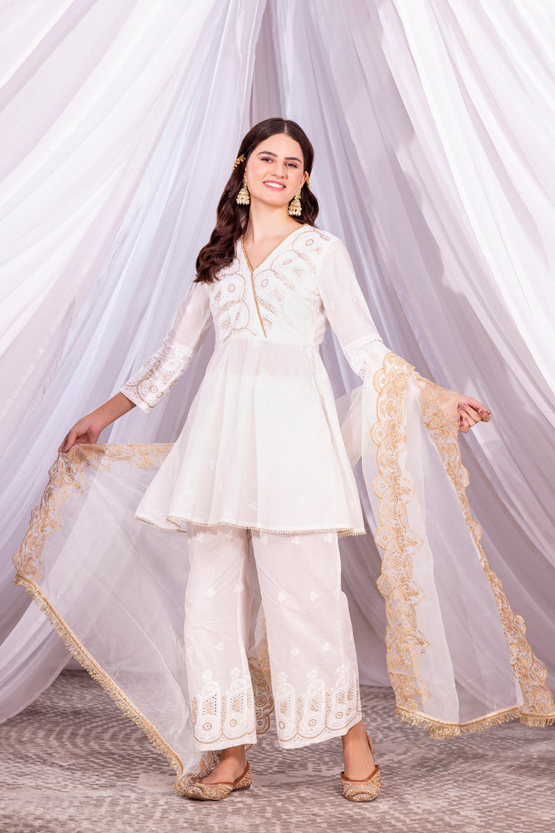 Embrace the summer with our ivory collection "चिटृॆ धागे", each outfit telling a timeless story of purity and elegance. Crafted with breathable fabrics, indigenous embroideries, white laces and celebrating the essence of Indian purity with every stitch. Embroidered with threads of love and rooted in tradition, Let your summer wardrobe shine in breathable mul fabric and chitta dhaaga details. Each set is paired with a sheer organza embroidered dupatta.
