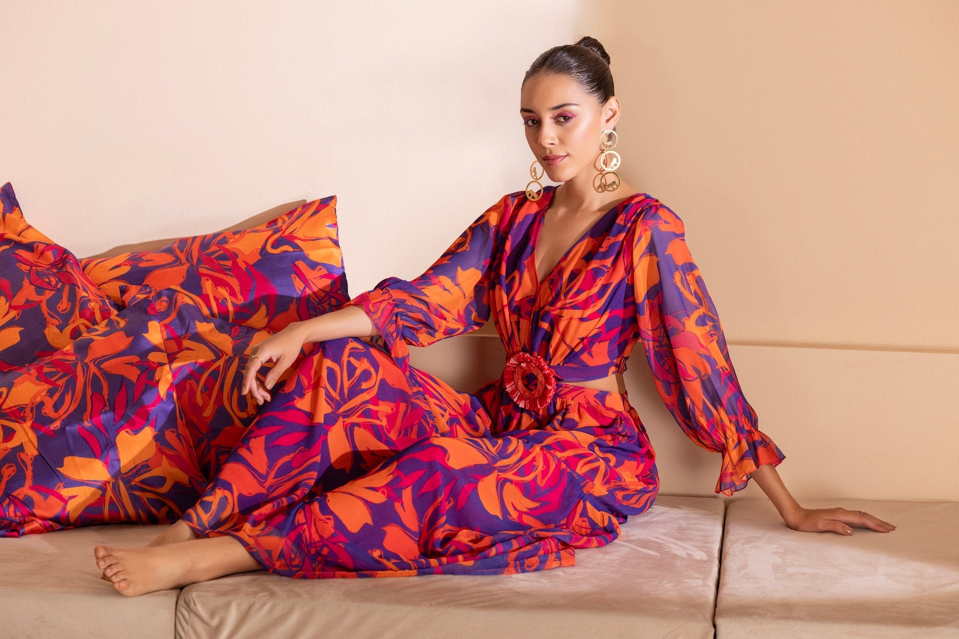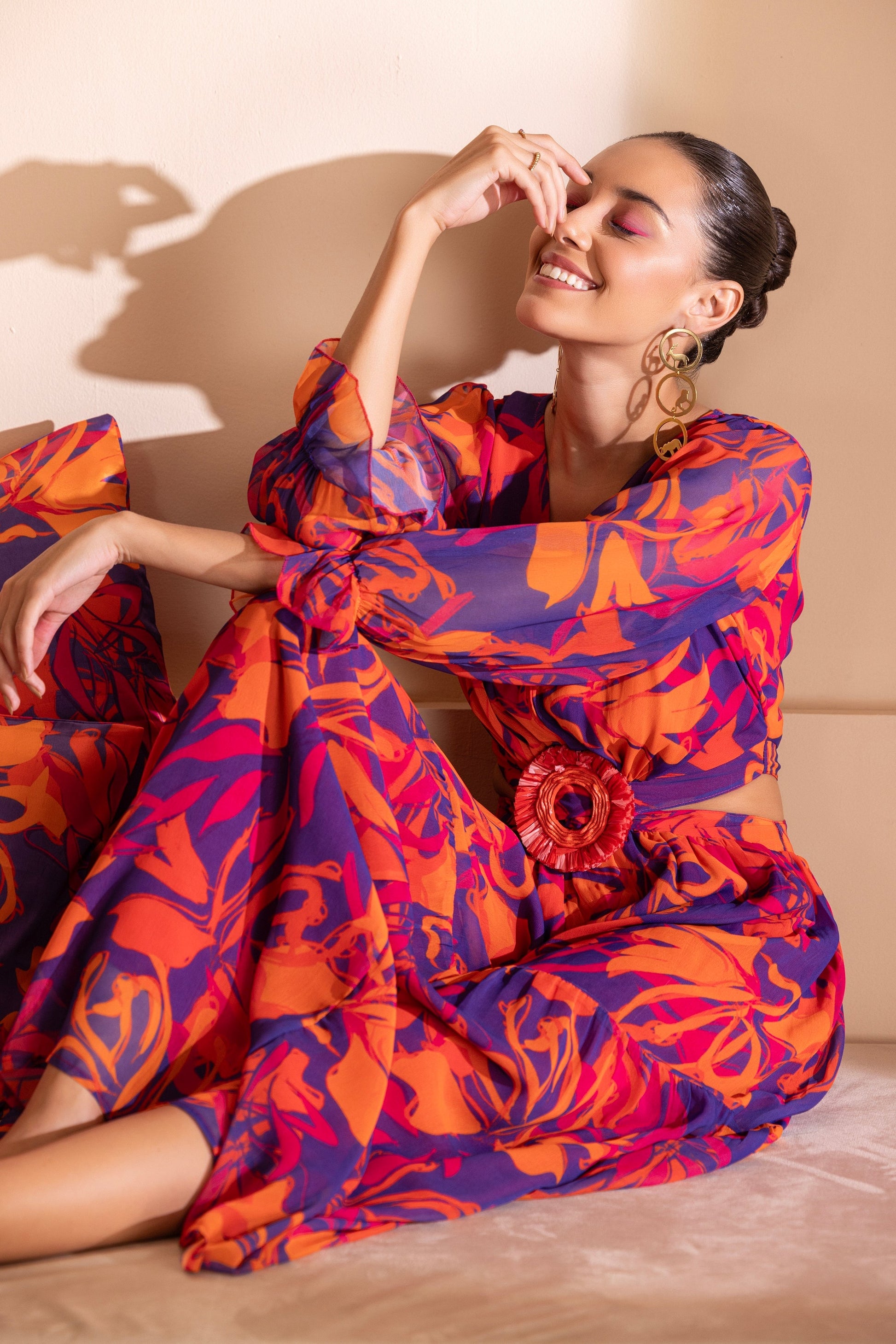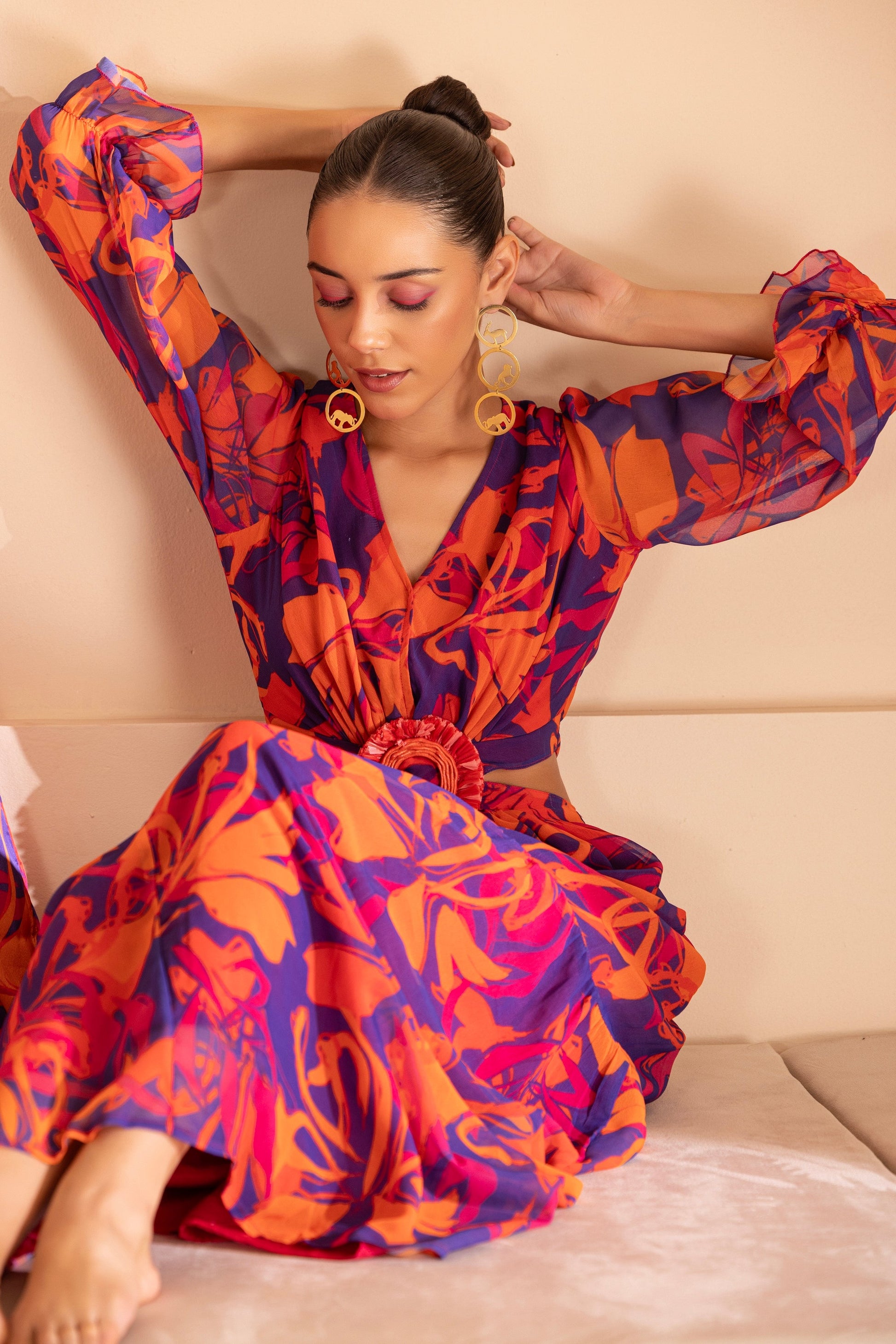 Step into the world of fashion paradise with this breathtaking Color Pop Printed Naxi Dress. The vibrant printed design and flowy silhouette make it perfect for those looking to make a statement at any occasion. Crafted with the most stunning printed georgette fabric, with loose sleeves and Tiered Flare, the cutout waist with fringed buckle makes for the most flattering silhouette and gives a dream fit. pair it with statement earrings and pair of pumps and let the outfit do the talking!