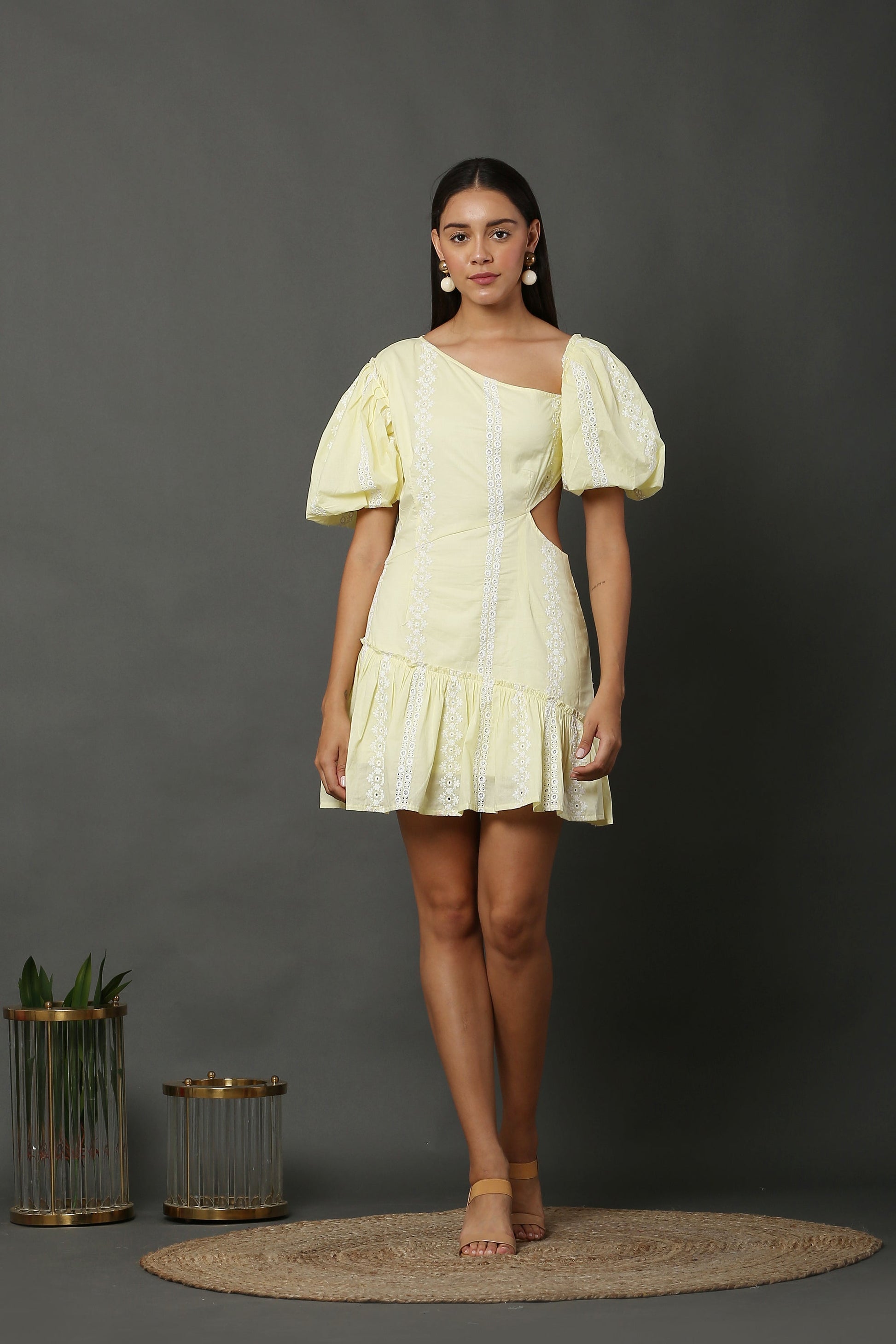 Get ready to rock your travel look in this Lemon schiffli embroidered short dress from SEW. This cotton dress is soft against the skin and light in weight. Crafted with balloon sleeves, Slanting neck, and beautiful cut at waist this dress gives a flattering fit with very little skin show. When the sun shines bright, put this dress on which gives looks cool with a beautiful fit and pair it with your sunnies and spot the perfect look
