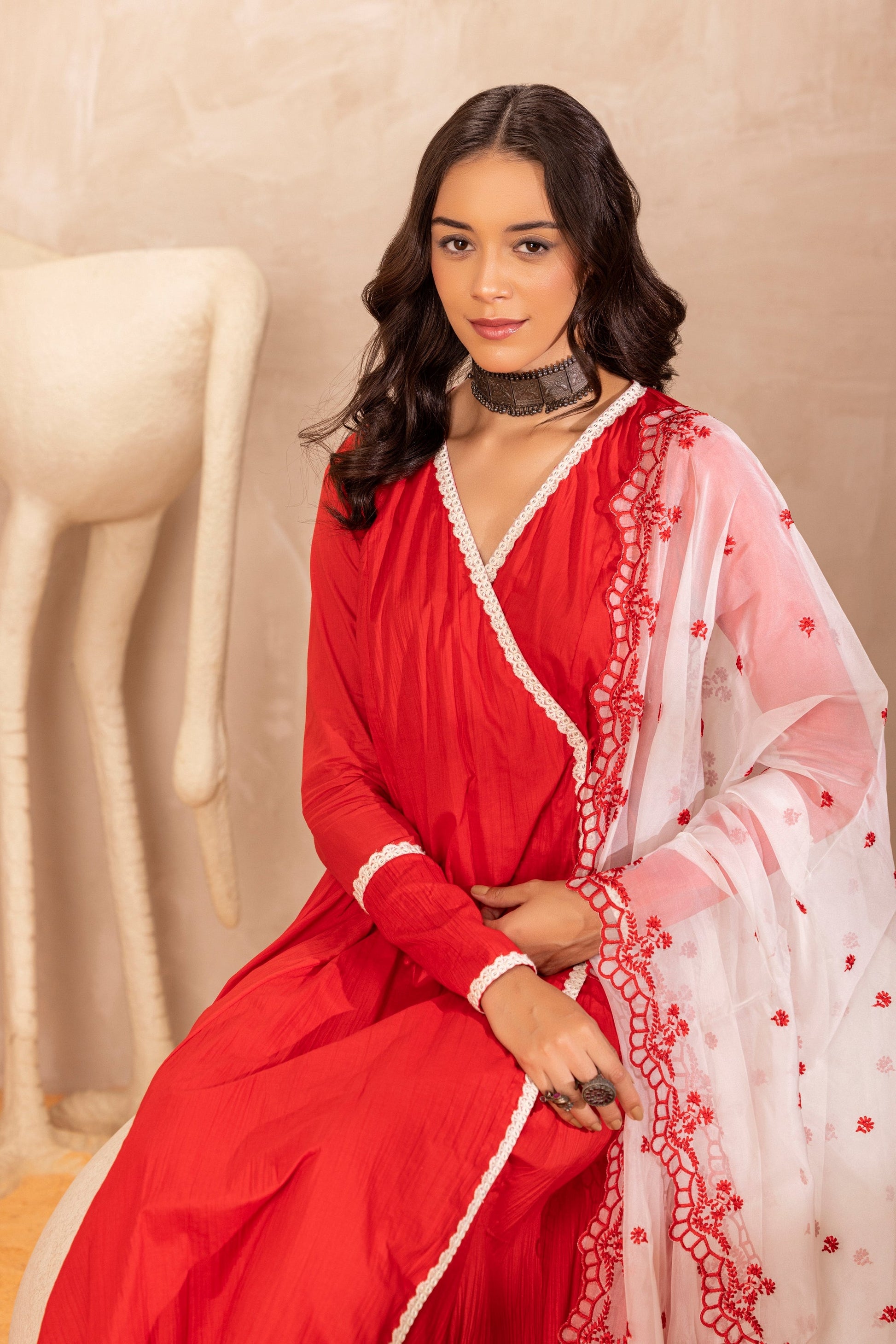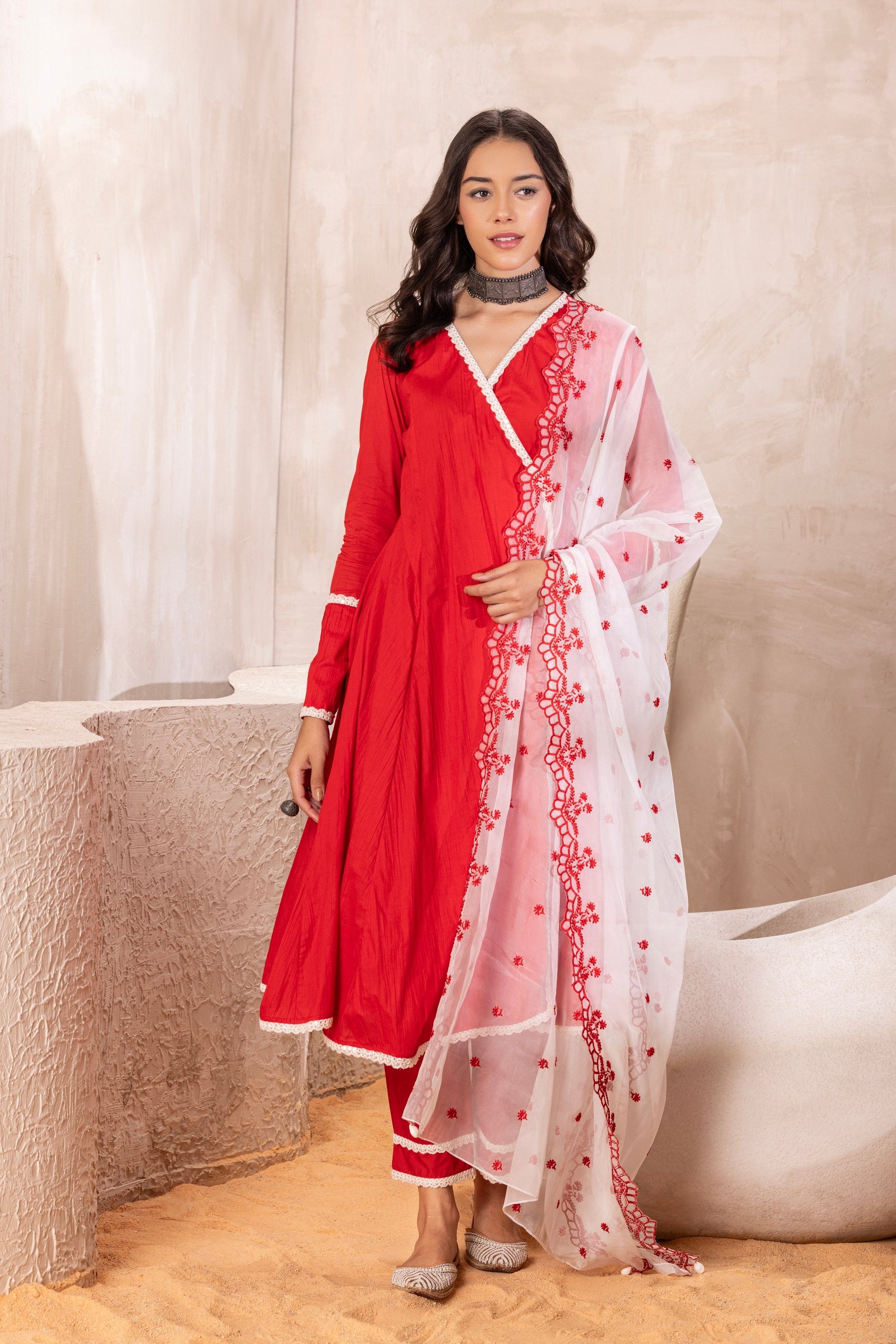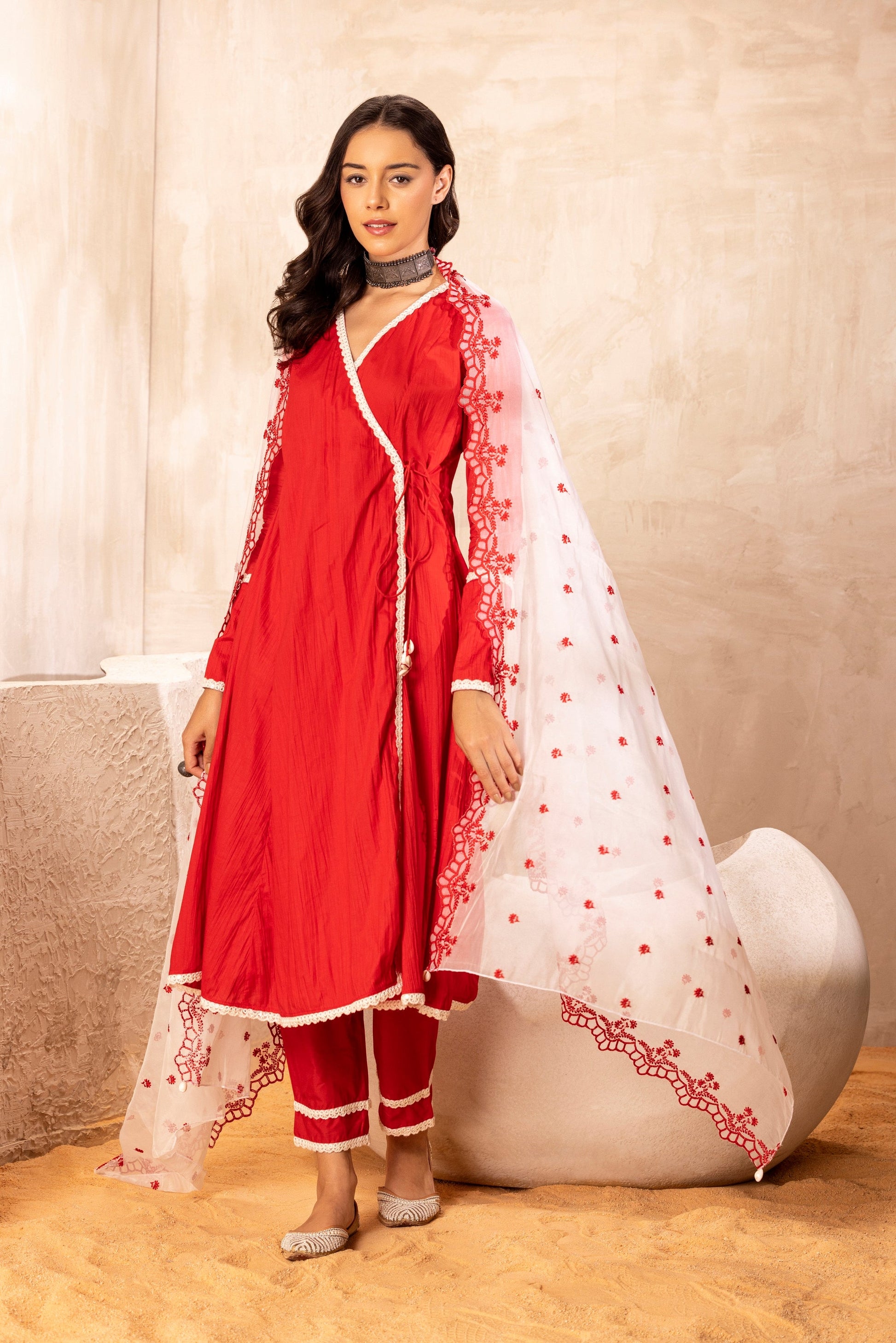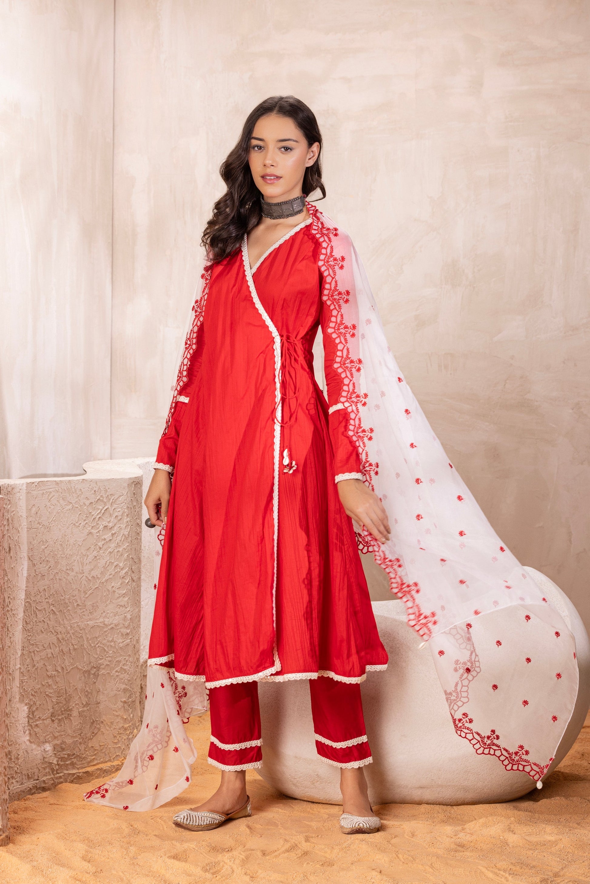 Feel like royalty wearing this mesmerizing angrakha style red kurta, adorned with delicate cream lace and a stunning contrast organza dupatta, featuring exquisite floral embroidery and scalloped borders. The Wrap around style with long kurta add length to the outfit and matching lace embossed pants create sophisticated style. Get ready to steal the spotlight and shine at every festive occassion.